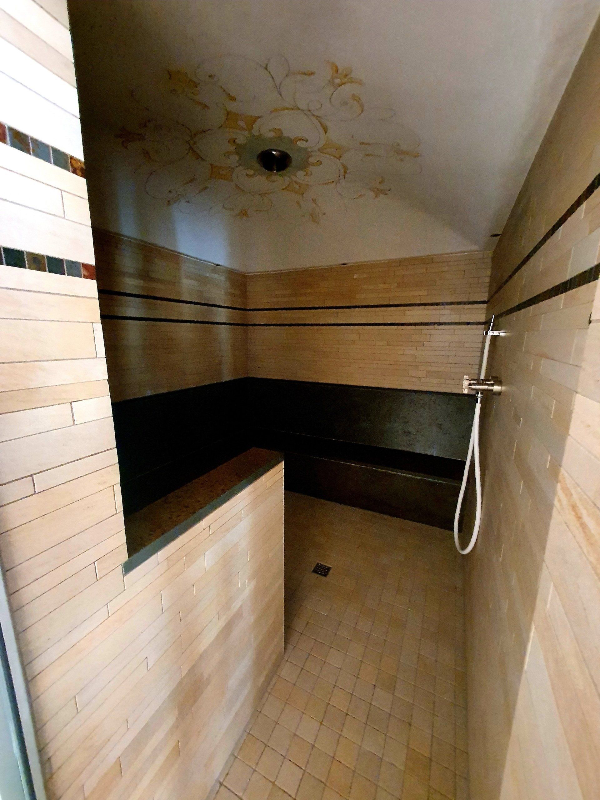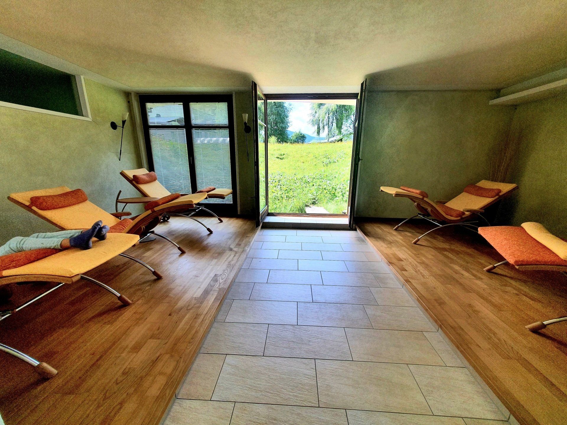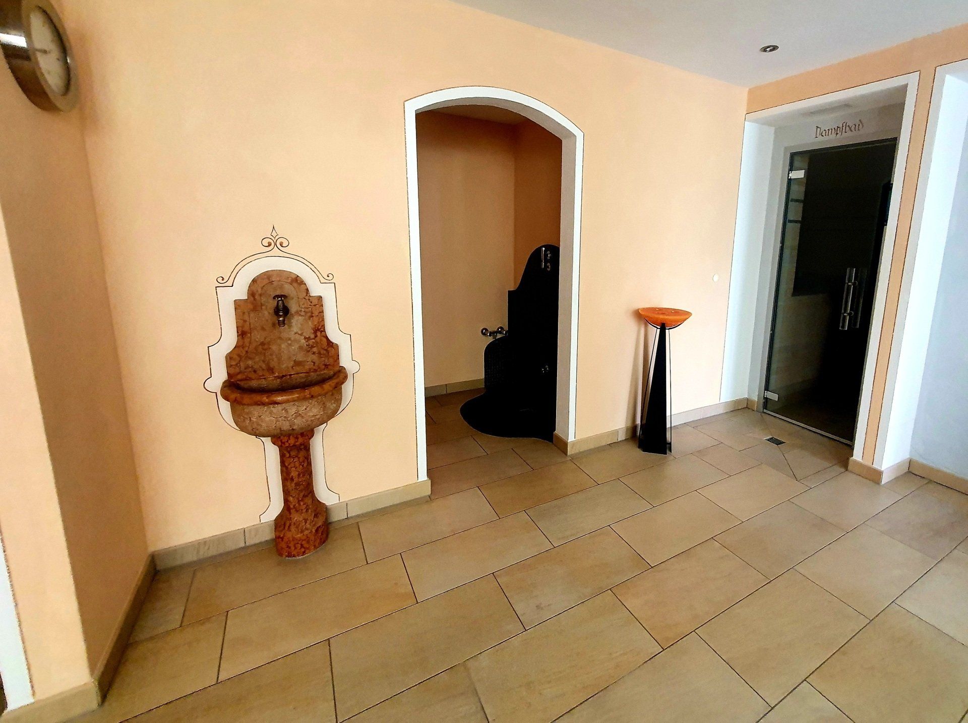 Im Untergeschoss befindet sich der Wellnessbereich mit Sauna und Dampfbad. Saunatücher sind vor Ort verfügbar.